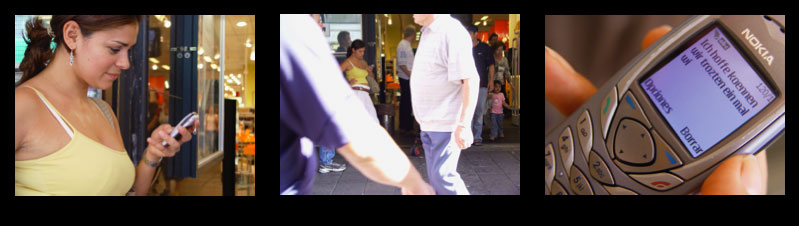 Die modernen Menschen sind über diese Textnachrichten mit einem fast schon fiktiven Gegenüber verbunden, der sich eigentlich nur in einer Wortmarke (dem Namen des Empfängers) auf dem Display manifestiert. Die Qualität der Kommunikation befindet sich auf einer neuartigen Ebene. Für eine kurze Zeit klinkt sich der Sender aus der Umgebung aus, vertieft sich in eine Zwischenwelt und schreibt die Nachricht. Der Inhalt verbindet die zwei Gesprächsteilnehmer, nicht aber die beiden Orte. So gesehen ist die Umgebung losgelöst vom Inhalt. Die Person, physisch präsent, kann wiederum als separate Instanz betrachtet werden. So ergibt sich ein Dreiergespann aus Sms, Person und Ort.